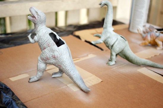4. Place figures on the newspaper/drop sheet with enough distance apart to spray all sides of each dinosaur.